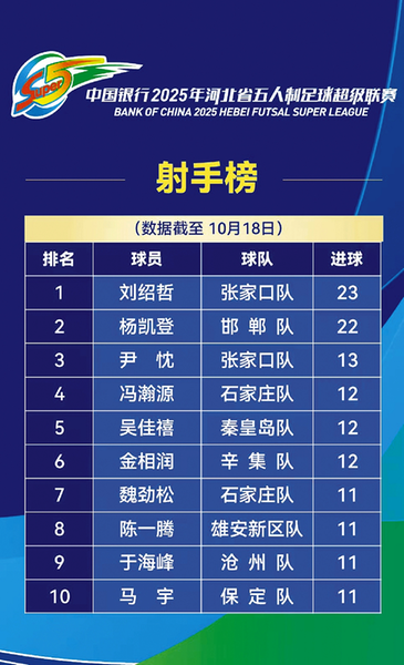相较于积分榜的稳定,第十轮射手榜迎来关键变动,张家口队的刘绍哲以23球成功逆袭,将榜首位置收入囊中。作为球队的进攻核心,刘绍哲的爆发式表现不仅助力张家口队稳居上游,更印证了河北本土球员在五人制足球领域的强劲实力。