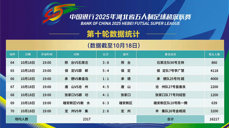 本报讯 10月18日晚,“河北五超”第十轮的角逐落下帷幕。本轮比赛延续了赛季以来高强度、高进球的火热基调,多场对决攻防节奏明快,战术博弈精彩纷呈,共计打进53粒进球,平均每场进球7.57个,为球迷奉献了一场场足球盛宴,燕赵大地的足球热情在秋日赛场持续升温。