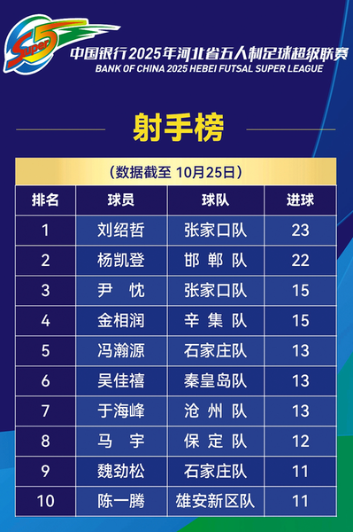 张家口队的刘绍哲以23粒进球延续领跑优势,其稳定的进球效率仍是球队冲击上游的重要保障;邯郸队的杨凯登以22球紧随其后;张家口队的尹忱凭借本轮比赛的出色发挥,以15粒进球依然保持第三名;辛集队的金相润跃居第四位。