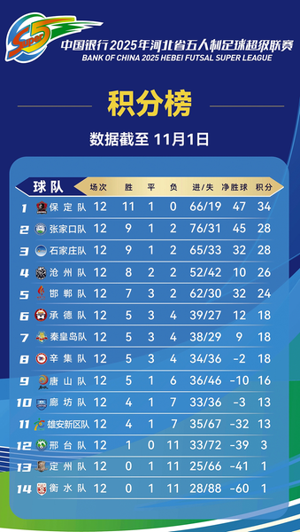 截至11月1日第12轮战罢,积分榜头部格局愈发清晰。保定队以11胜1平的不败战绩,积34分继续稳坐积分榜首位,66粒进球与19粒失球的表现尽显统治力。张家口队和石家庄队同积28分,分列第二、三位,张家口队凭借76粒进球的火力优势稍占先机;沧州队积26分排名第四,邯郸队积24分位居第五。承德队、秦皇岛队、辛集队同积18分,在第六至八位展开激烈争夺;唐山队、廊坊队、雄安新区队、邢台队、定州队、衡水队依次排在第九至十四位,后续排名竞争依旧充满变数。