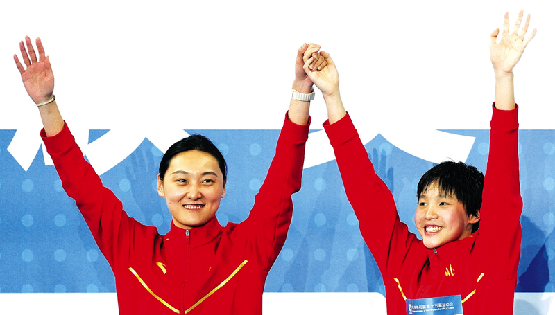 ■于子迪(右)和教练在游泳女子200米个人混合泳颁奖仪式上庆祝。 十五运官网