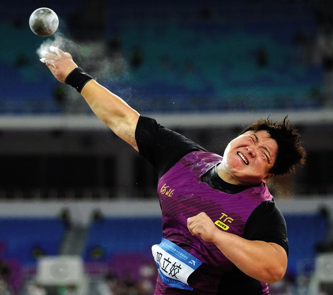 ■巩立姣在比赛中。 新华社 本报讯 11月16日,第十五届全运会女子铅球项目在广东省奥体中心体育场举行,河北三名运动员包揽前三名。奥运冠军巩立姣以19米68的成绩夺得冠军,这是她第五次夺得全运会该项目的金牌,实现了五连冠。河北另外两名运动员张林茹和马越分获银牌和铜牌,展示了河北队在女子铅球项目上的强大实力。